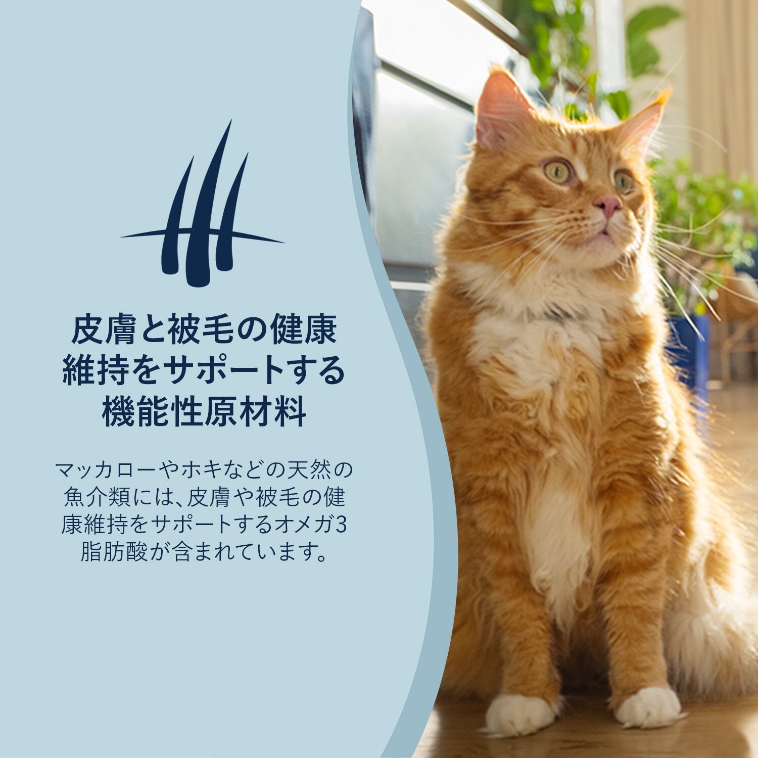 皮膚と被毛の健康維持をサポートするオメガ3脂肪酸を豊富に配合しています。