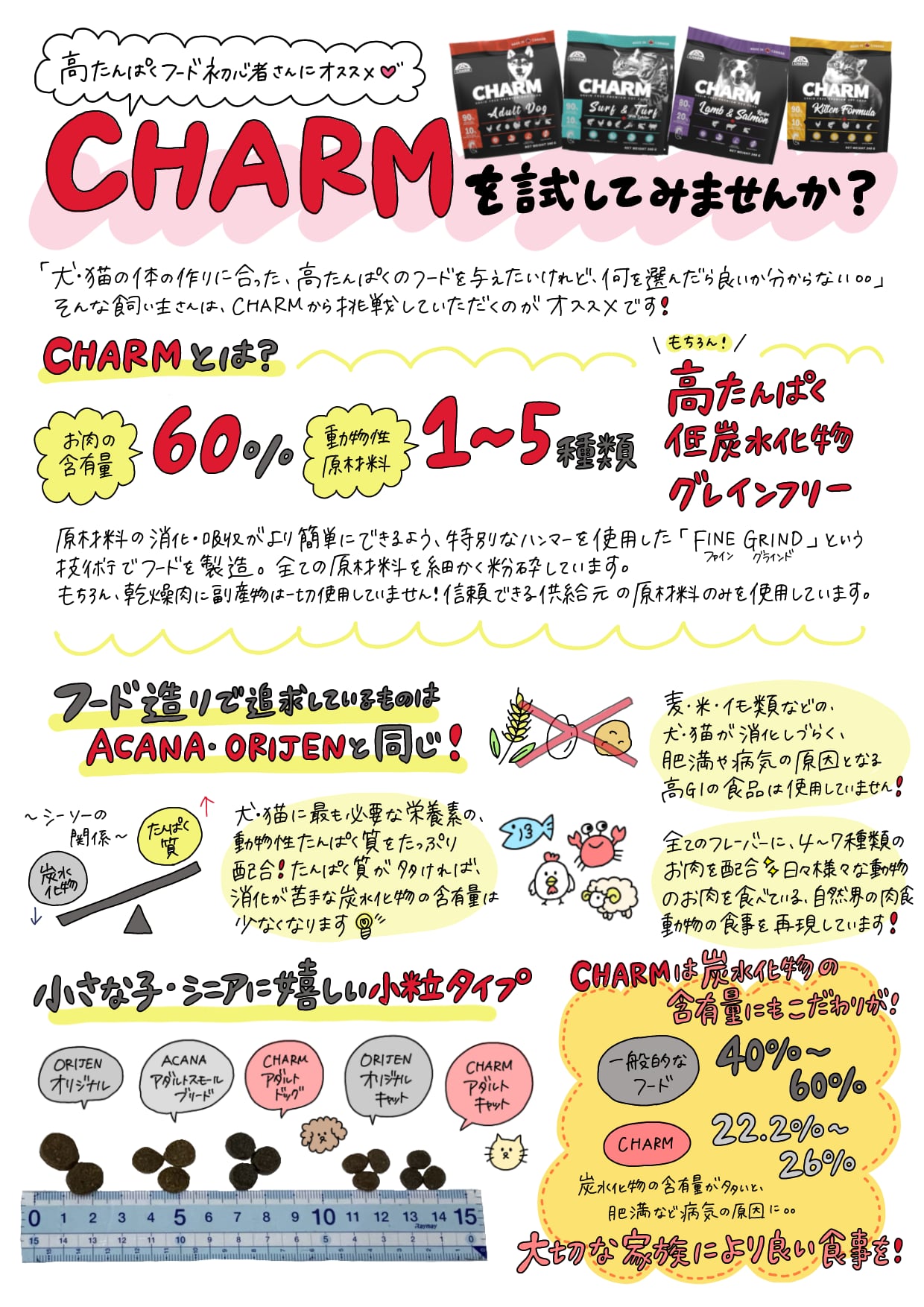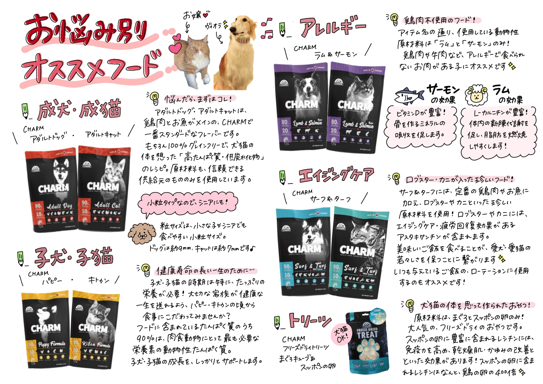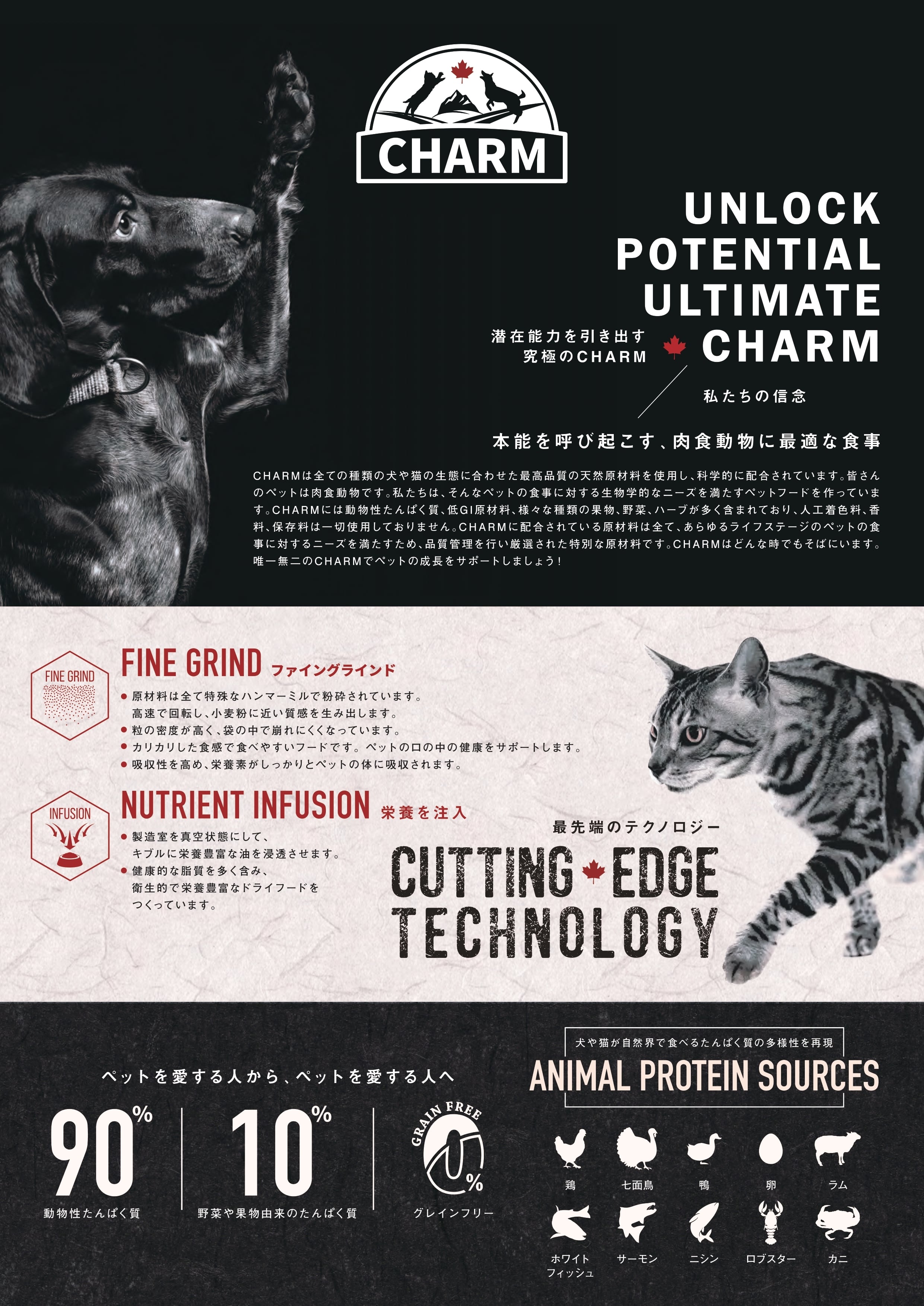 チャーム アダルトドッグは、成犬が最高の健康状態を維持できるよう特別に配合されています。Non-GMO(非遺伝子組み換え)原材料を使用し、トウモロコシや小麦、大豆を含まない100%グレインフリーで、人工着色料や香料は使用していません。動物性たんぱく質を90%配合し、7種類の異なる動物性たんぱく質を使用しています。このたんぱく質豊富な食事は、内臓の健康や引き締まった筋肉に役立ちます。野菜や果物由来の繊維やプレバイオティクスをブレンドすることで、最適な消化を促します。関節の健康や滑らかな動きをサポートするため、グルコサミンやコンドロイチンを加えています。愛犬が喜ぶ風味となっているだけではなく、愛犬の体の状態も最大限に引き上げます。