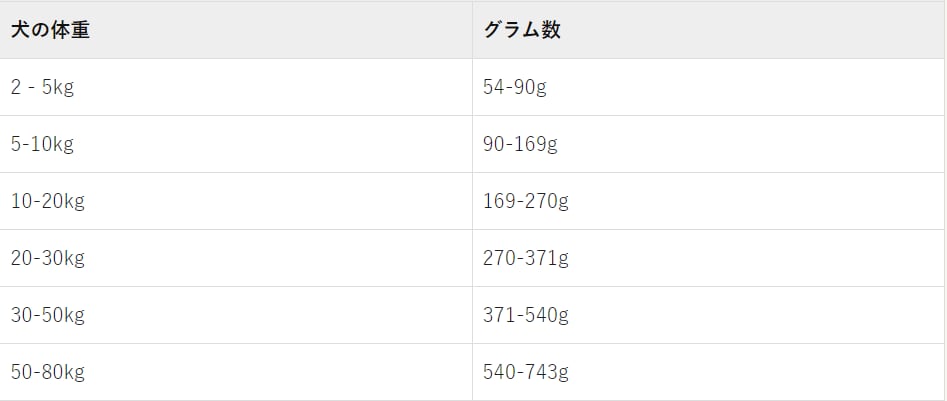 ※それぞれのペットの年齢、犬種、環境、運動量によって、ペットが必要とするフードの量はこの表とは異なる場合があります。ペットの状態を観察し、必要に応じて調整してください。1日に2回給餌し、ペットが新鮮できれいな水を常に飲めるようにしてください。