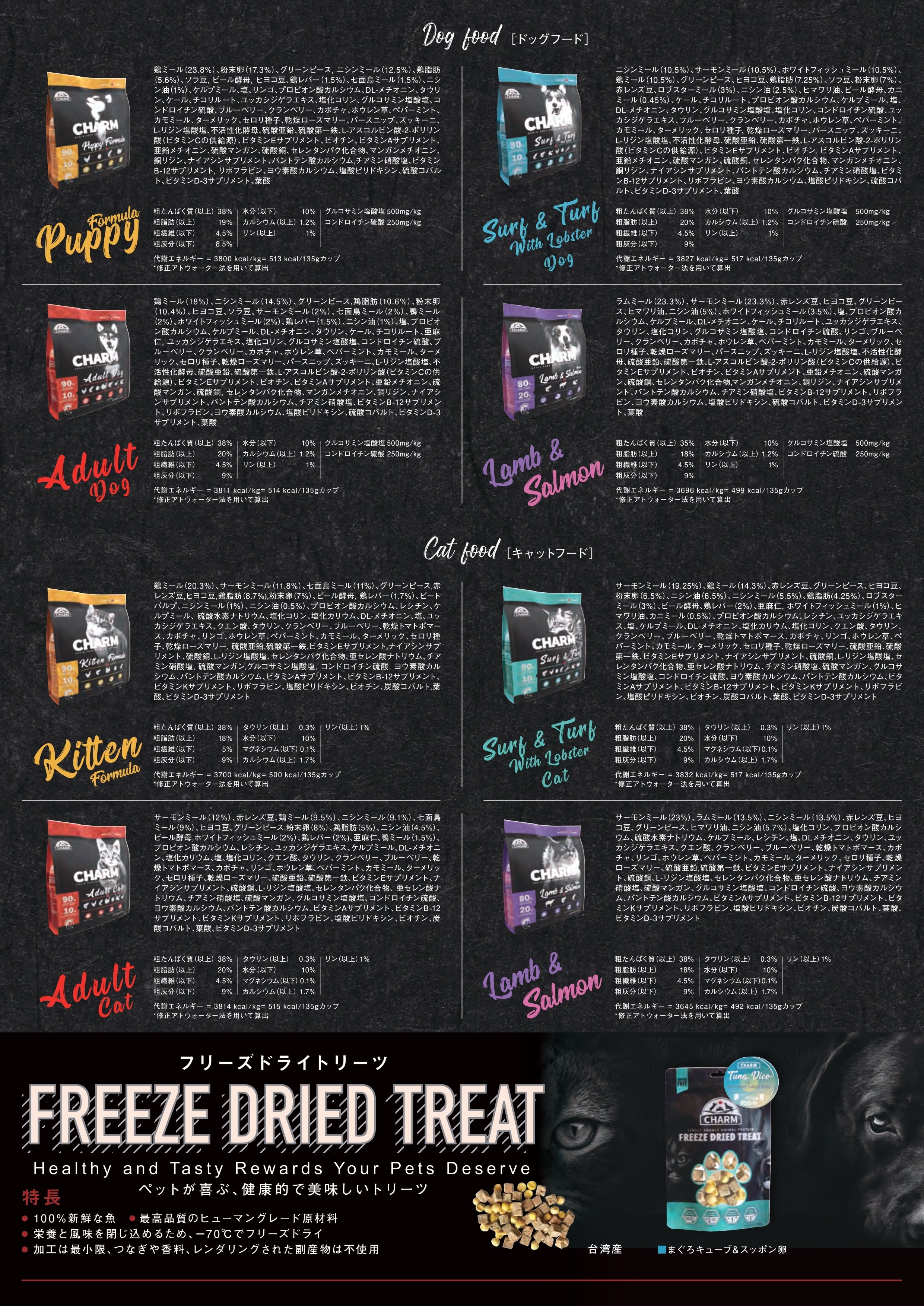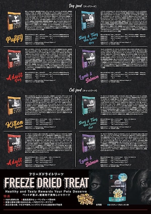 鶏ミール (18%), ニシンミール (14.5%), グリーンピース, 鶏脂肪 (10.6%), 粉末卵 (10.4%), ヒヨコ豆, ソラ豆, サーモンミール (2%), 七面鳥ミール (2%), 鴨ミール (2%), ホワイトフィッシュミール (2%), 鶏レバー (1.5%), ニシン油 (1%), 塩, プロピオン酸カルシウム, ケルプミール, DL-メチオニン, タウリン, ケール, チコリルート, 亜麻仁, ユッカシジゲラエキス, 塩化コリン, グルコサミン塩酸塩, コンドロイチン硫酸, ブルーベリー, クランベリー, カボチャ, ホウレン草, ペパーミント, カモミール, ターメリック, セロリ種子, 乾燥ローズマリー, パースニップ, ズッキーニ, L-リジン塩酸塩, 不活性化酵母, 硫酸亜鉛, 硫酸第一鉄, L-アスコルビン酸-2-ポリリン酸(ビタミンCの供給源), ビタミンEサプリメント, ビオチン, ビタミンAサプリメント, 亜鉛メチオニン, 硫酸マンガン, 硫酸銅, セレンタンパク化合物, マンガンメチオニン, 銅リジン, ナイアシンサプリメント, パントテン酸カルシウム, チアミン硝酸塩, ビタミンB-12サプリメント, リボフラビン, ヨウ素酸カルシウム, 塩酸ピリドキシン, 硫酸コバルト, ビタミンD-3サプリメント, 葉酸