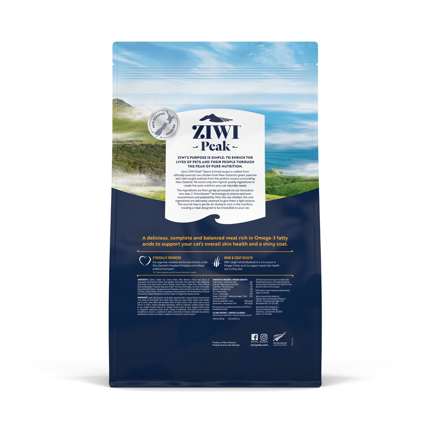 ニュージーランドの緑豊かな牧草地で倫理的な方法で調達されたチキン生肉と、皮膚と被毛の健康維持をサポートするオメガ3脂肪酸の供給源となる天然の丸ごとマッカローを使用して作られています。革新的な2段階のZ-MicroSteam™製法により、ゆっくりマイクロスチームし、丁寧にエアドライすることで、最適な栄養と嗜好性を提供します。