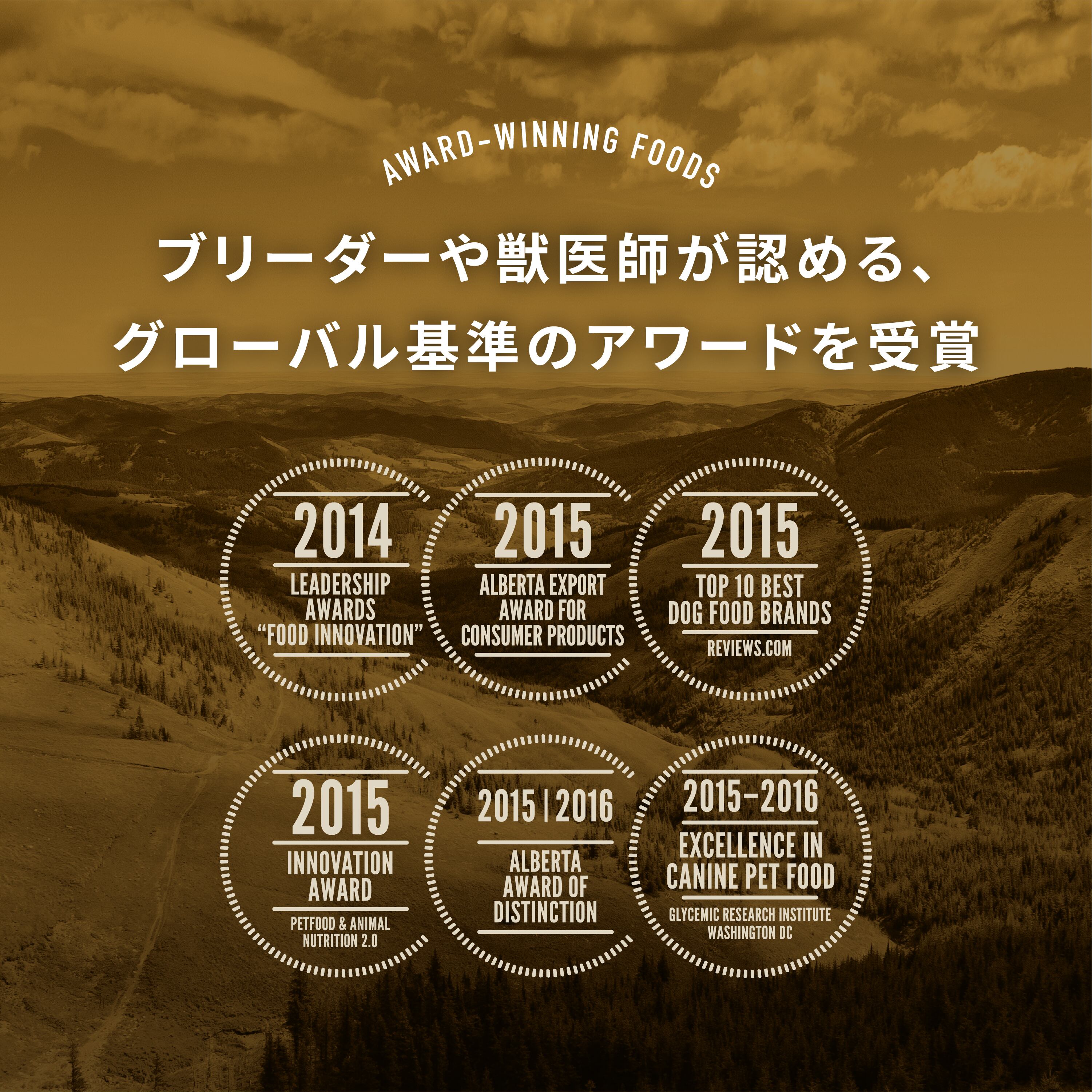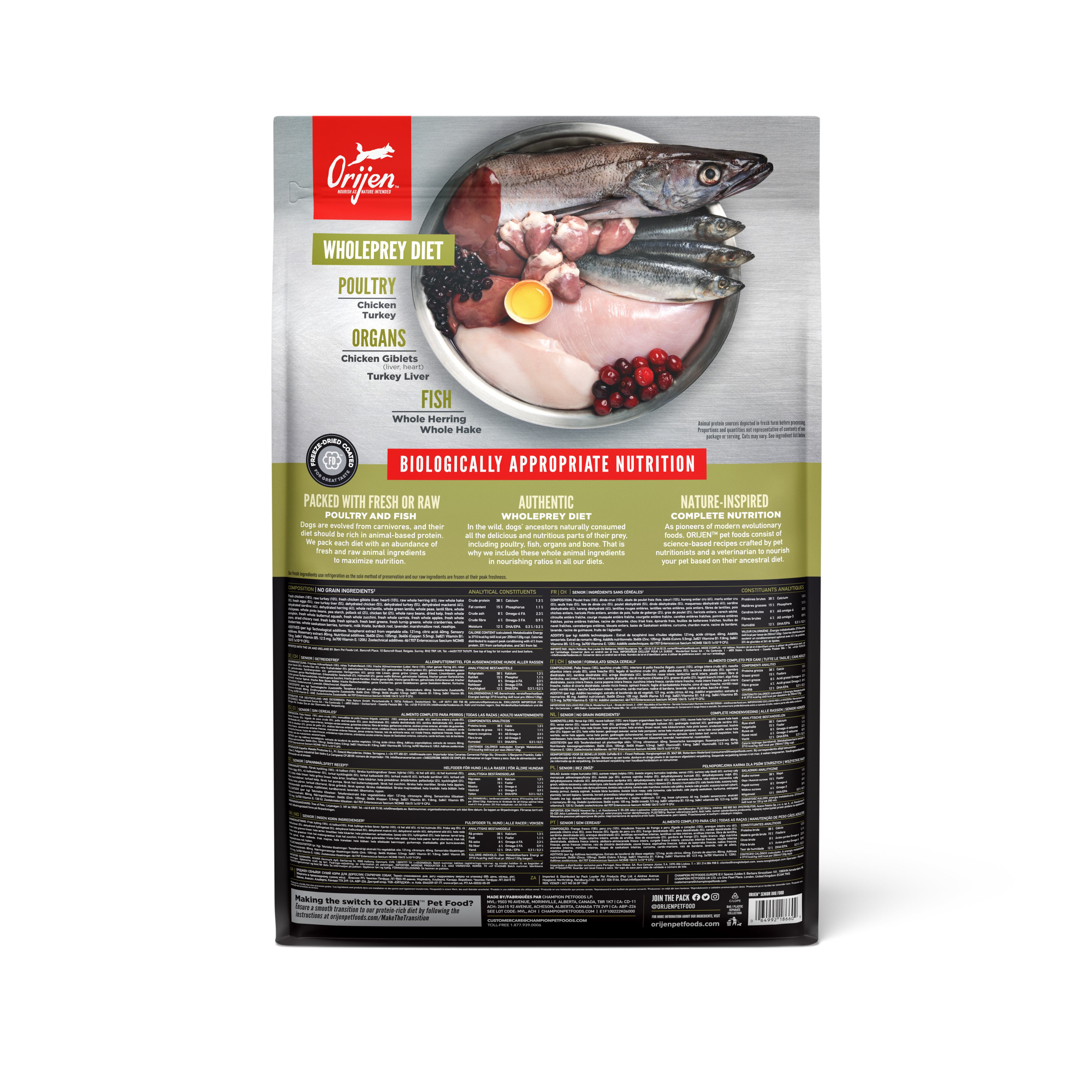新鮮鶏肉 (18%), 生七面鳥肉(10%), 新鮮鶏内臓(レバー, 心臓) (10%), 生の丸ごとニシン (6%), 生の丸ごとヘイク (5%), 新鮮卵 (5%), 生七面鳥レバー (5%), ディハイドレート鶏肉 (5%), ディハイドレート七面鳥肉 (5%), ディハイドレートサバ (4%), ディハイドレートイワシ (4%), ディハイドレートニシン (4%), 丸ごと赤レンズ豆, 丸ごと緑レンズ豆, 丸ごとエンドウ豆, レンズ豆繊維, 丸ごとヒヨコ豆, 丸ごとピント豆, エンドウ豆スターチ, ポロック油 (2%), 鶏脂肪 (2%), 丸ごと白インゲン豆, 乾燥ケルプ, 新鮮丸ごとカボチャ, 新鮮丸ごとバターナッツスクワッシュ, 新鮮丸ごとズッキーニ, 新鮮丸ごとニンジン, 新鮮丸ごとリンゴ, 新鮮丸ごと洋梨, 乾燥チコリールート, 新鮮ケール, 新鮮ホウレン草, 新鮮ビートの葉, 新鮮カブラ菜, 丸ごとクランベリー, 丸ごとブルーベリー, 丸ごとサスカトゥーンベリー, ターメリック, オオアザミ, ゴボウ, ラベンダー, マシュマロルート, ローズヒップ 酸化防止剤: 植物油から抽出したトコフェロール: 121mg, クエン酸: 40mg, ローズマリーエキス: 80mg 添加栄養素(1kgあたり): 3b606 (亜鉛: 105mg), 3b406 (銅: 5.5mg), 3a821 ビタミンB1: 9.8mg, 3a841 ビタミンB5: 12.5 mg, 3a700 ビタミンE: 120IU 添加腸球菌: 4b1707 エンテロコッカスフェシウム菌NCIMB 10415 1x10^9CFU